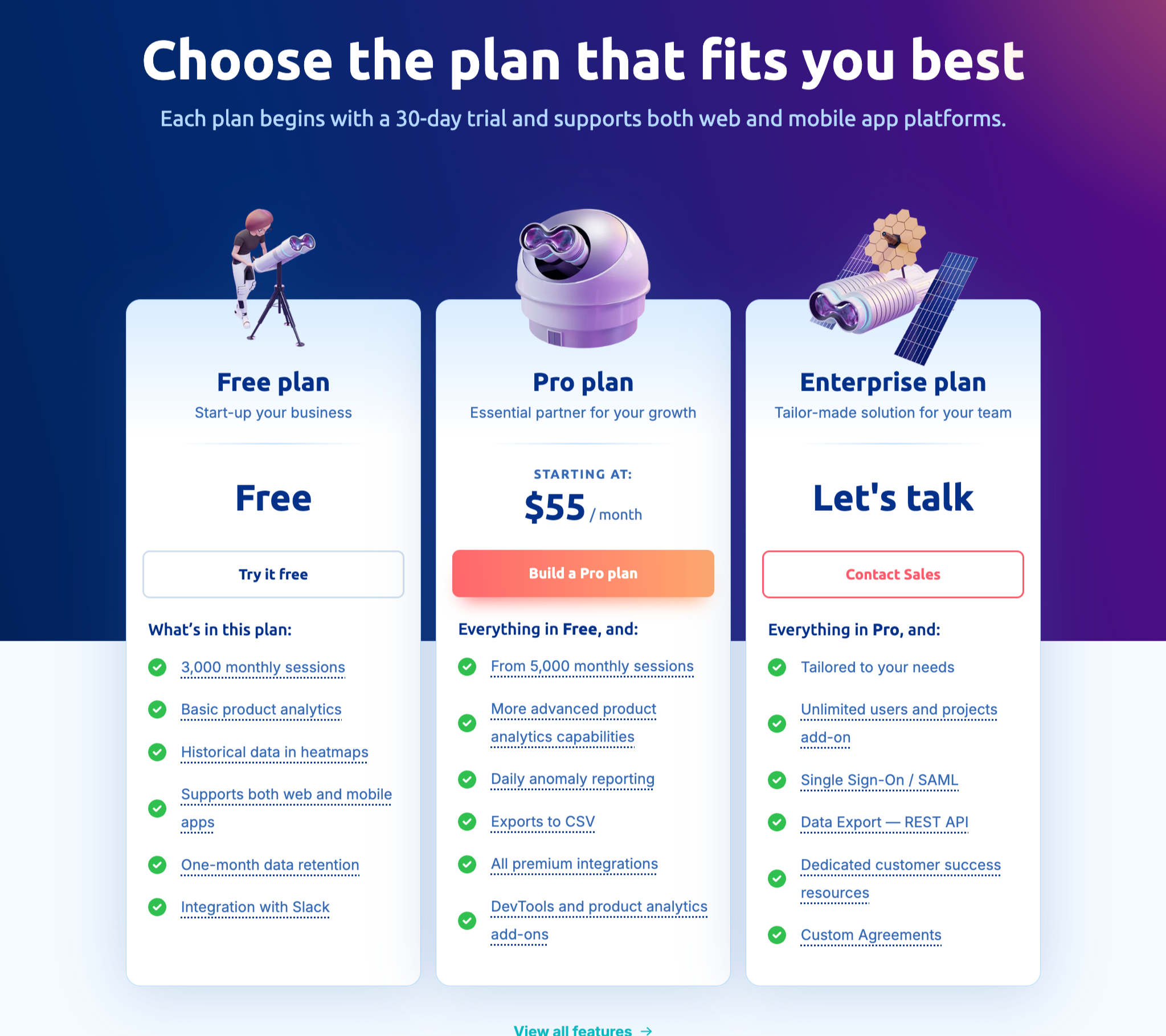 Session limits matter more than you’d expect. I’ve seen teams hit their session limit mid-month, and Smartlook stops recording until the next billing cycle. You’re blind for the rest of the month unless you upgrade or enable sampling.