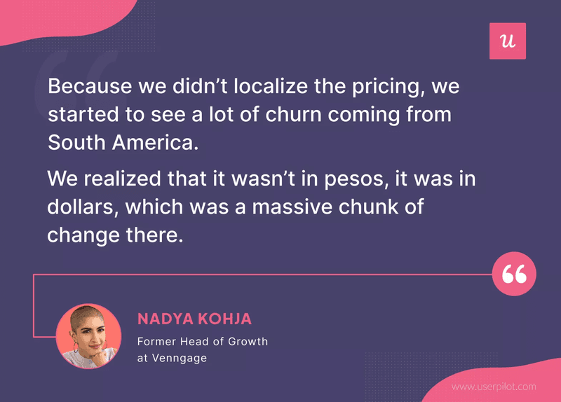 “Because we didn’t localize the pricing, we started to see a lot of churn coming from South America. We realized that it wasn’t in pesos, it was in dollars, which was a massive chunk of change there.” – Nadya Kohja, former Head of Growth at Venngage