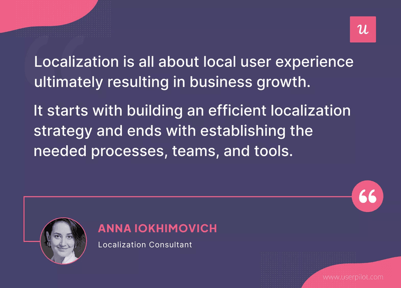 “Localization is all about local user experience ultimately resulting in business growth. It starts with building an efficient localization strategy and ends with establishing the needed processes, teams, and tools.“- Anna Iokhimovich, localization consultant