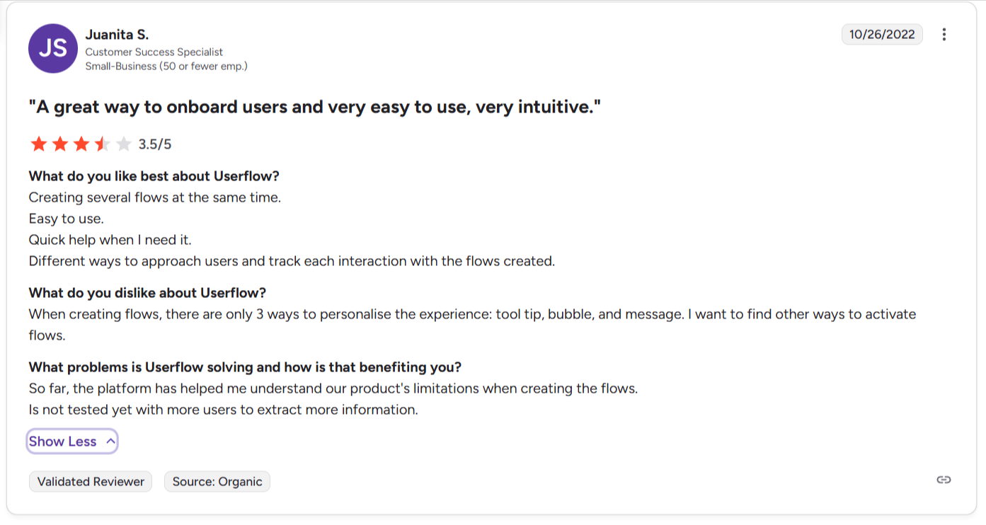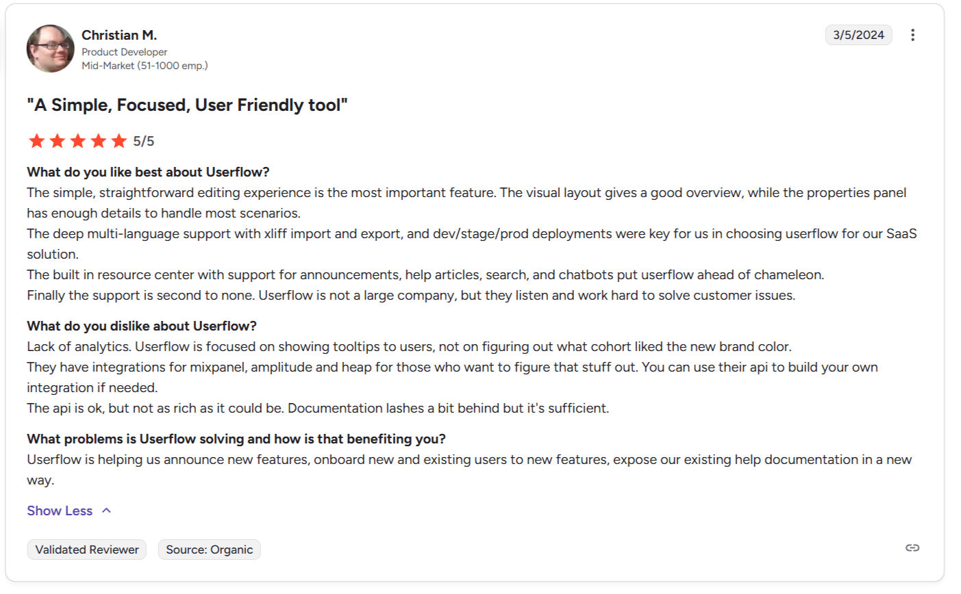 Userflow is a polished tool suitable for small, web-only startups with healthy budgets and low headcount. The UI is excellent, and the builder is smooth, making it a great choice for small teams.