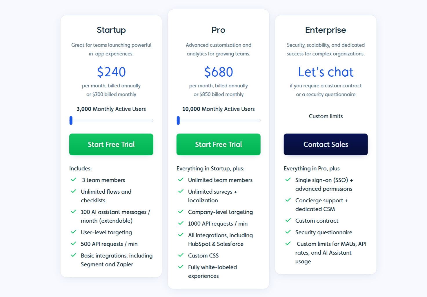 The Startup plan starts at $240 per month for 3,000 MAUs, 100 AI assistant messages, and 3 seats. You get access to the flow builder (with unlimited themes), checklists, simple flow analytics, and basic integrations.