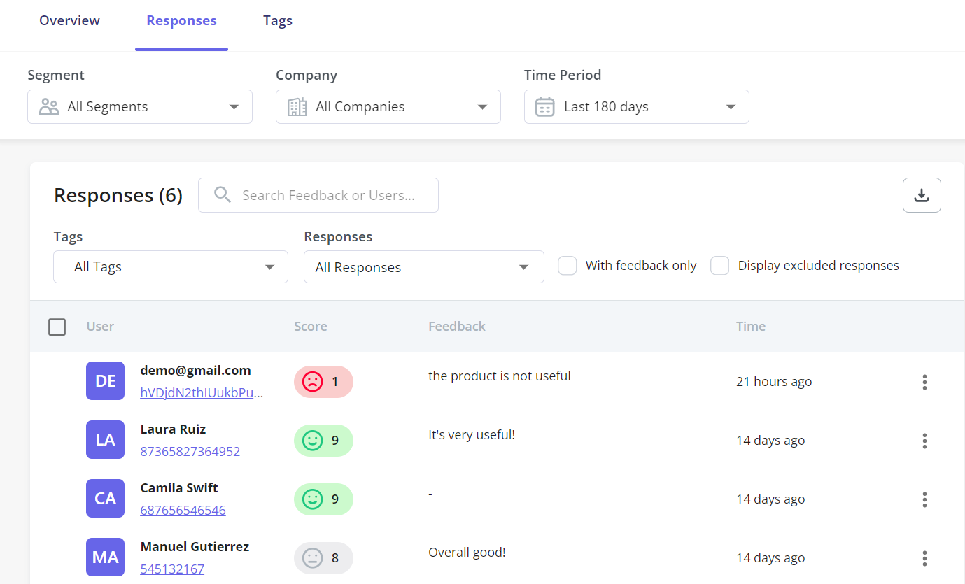 • NPS response tagging: Besides tracking NPS scores over time, Userpilot lets you filter users based on recurrent keywords mentioned across NPS responses. This lets you understand common themes across detractors or promoters, and segment them.