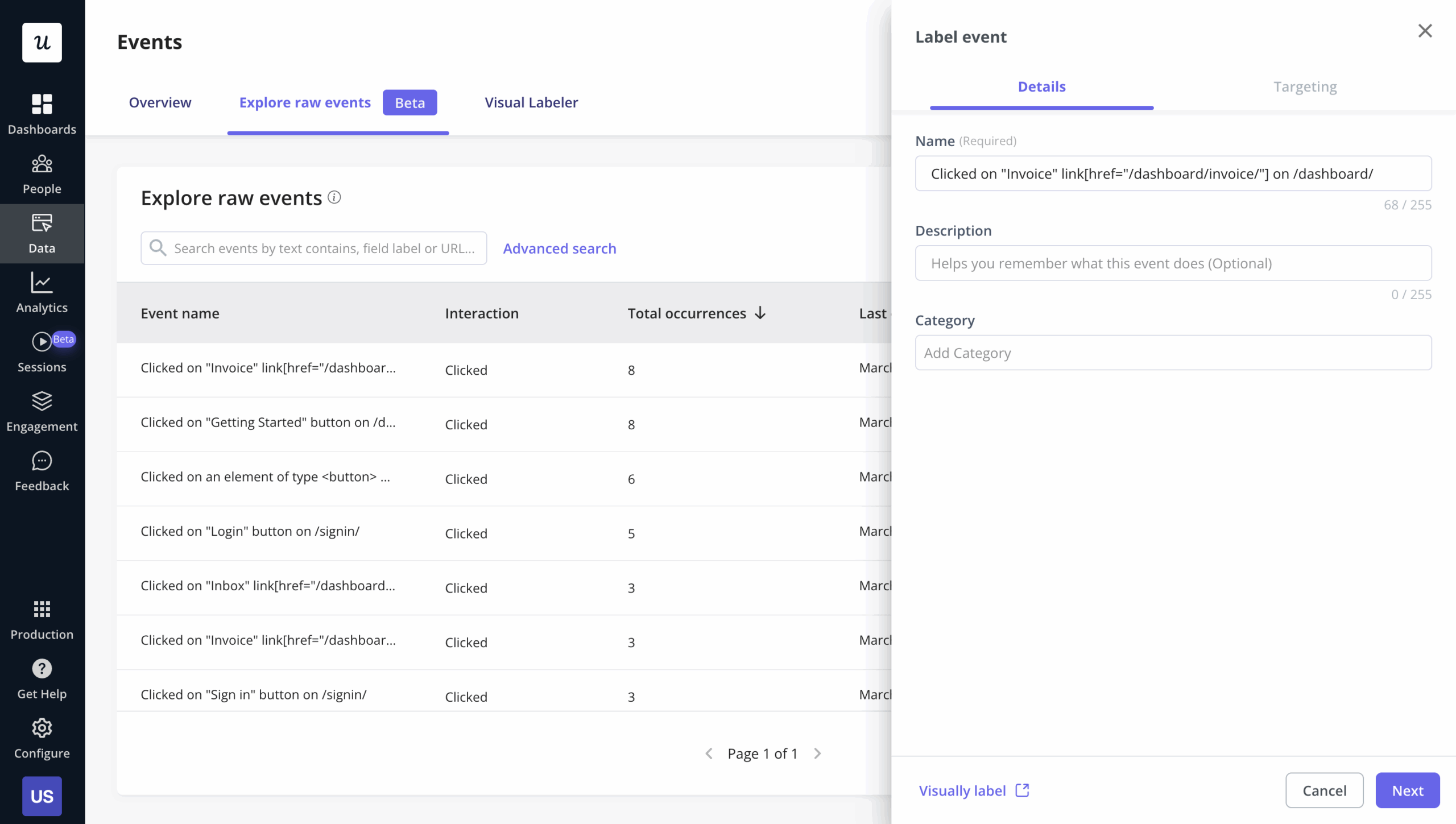 • Autocaptured events: With autocapture, you don’t have to instrument events manually right after setting it up. It will start tracking event data automatically upon setup and all you need to do is label them before creating a report.