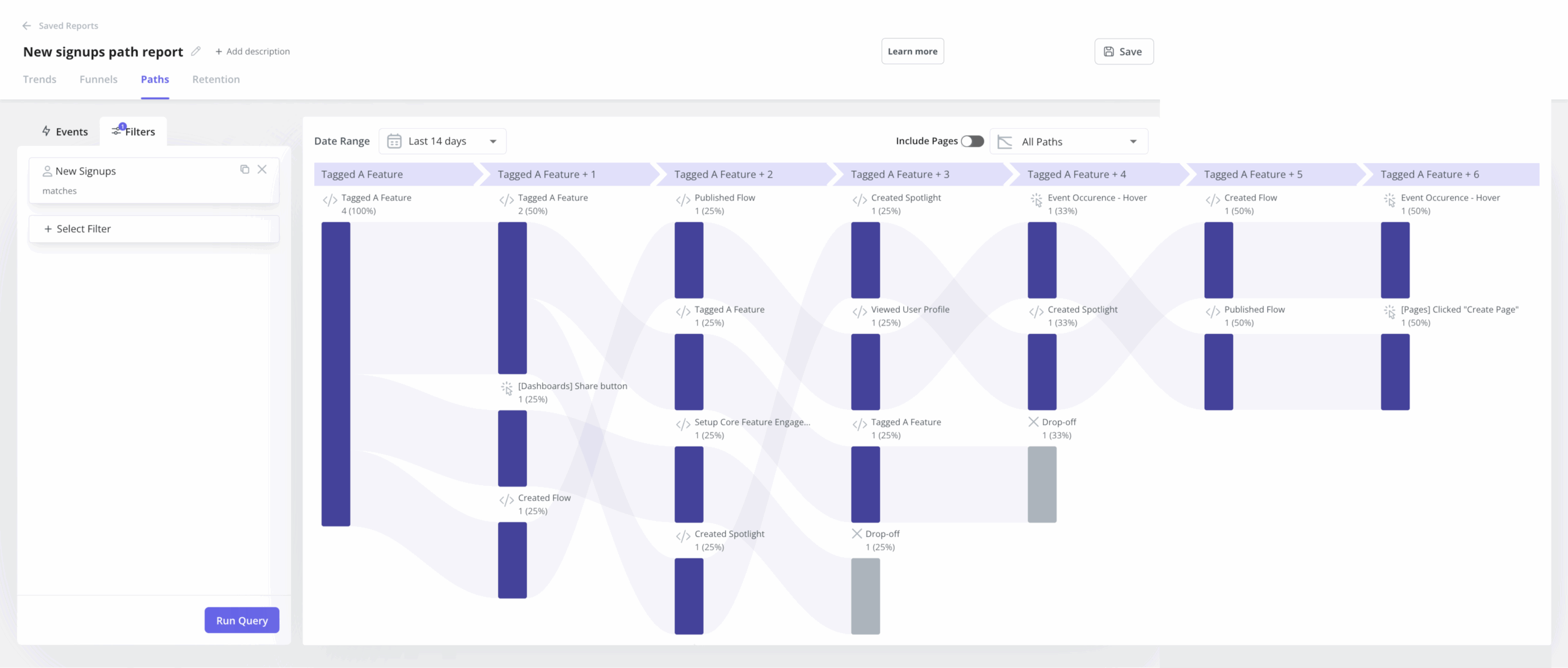 • Native analytics: You don’t need a separate subscription for product analytics because we offer trends, funnels, and path analysis natively. This allows you to correlate flow engagement directly with feature adoption without complex data piping.