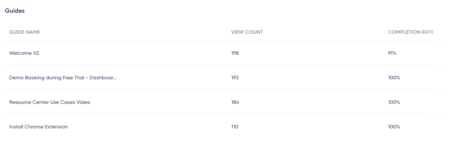 - Content Engagement: While UserGuiding lacks more detailed growth metrics, it does track engagement for all materials created within the platform. This lets you monitor the view count and completion rate for guides, checklists, or other UserGuiding material currently in use.