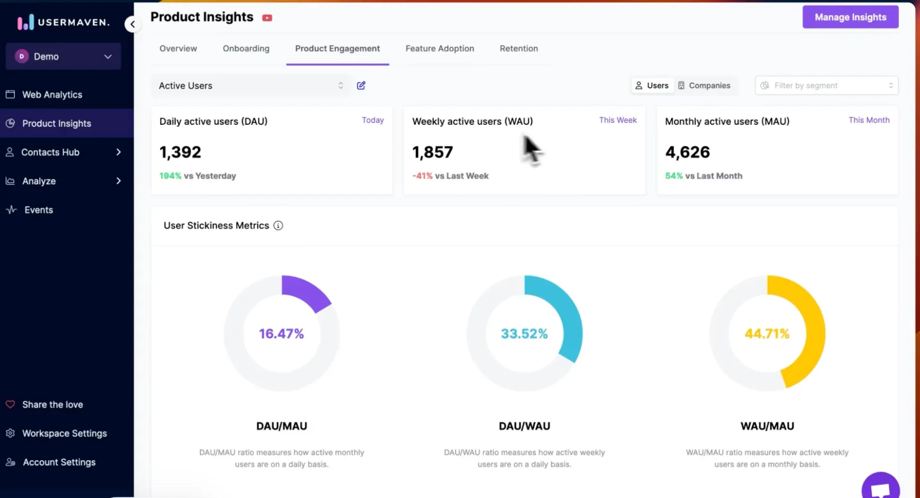 - Product engagement: Measures how actively users interact with your product over time. It tracks key metrics like daily, weekly, and monthly active users, along with stickiness ratios such as DAU/MAU. This dashboard helps you understand whether users are forming habits. Insights can be viewed at the user or company level.