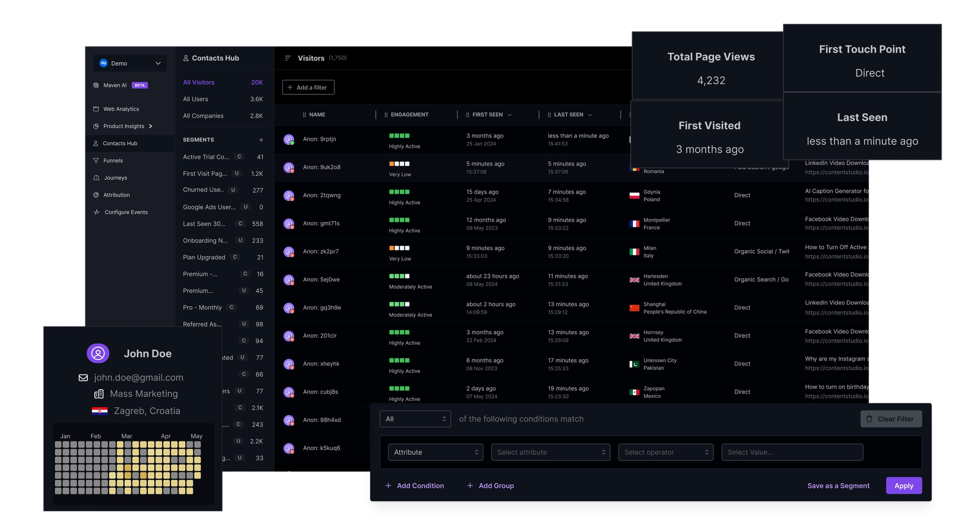At its core, the Contacts Hub collects and organizes every touchpoint into unified profiles, including first and last-seen activity, user engagement levels, session history, UTM marketing data, device info, and more.