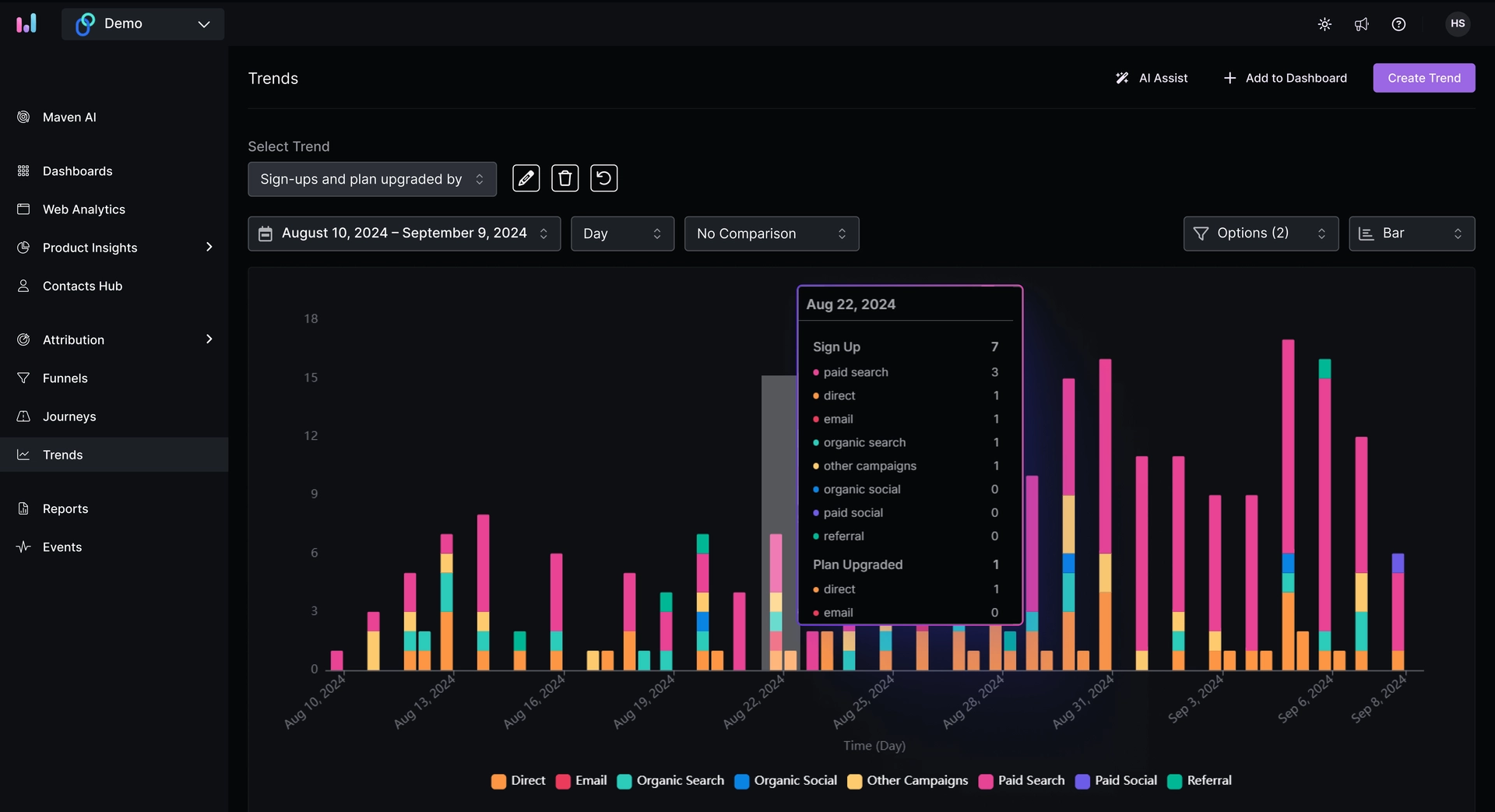 You can also break down trend lines by properties like country, device type, user segment, or plan type, giving context to why things are happening.