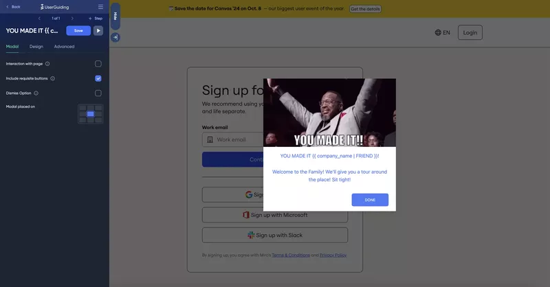 - Onboarding engagement: Multiple UI patterns, checklists, resource center, and more. All of them come with advanced condition settings, localization, and customizable designs so you can tailor them to your target audience. Without coding or technical knowledge.