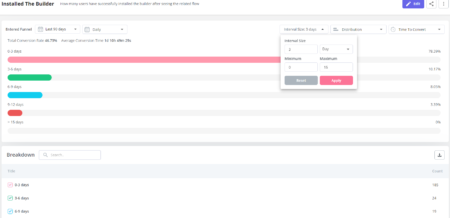 - Duration: The granular funnel analytics can offer more insights into each stage of a particular user funnel, such as how long it took the majority of your users to complete it from start to finish. You can filter by time period and set minimum/maximum parameters to remove outliers.