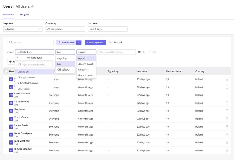 - Autocapture: Instead of setting up manual event tracking, Userpilot automatically captures user interactions like clicks, form submissions, and feature usage. This helps save time and ensures you don’t miss any important user data.