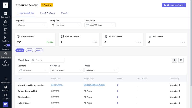 - Resource center: Userpilot’s Resource Center gives your users on-demand help inside your app. You can add guides, checklists, FAQs, and product updates so users can quickly find answers. You can also customize the look, control who sees what, and track engagement with analytics.