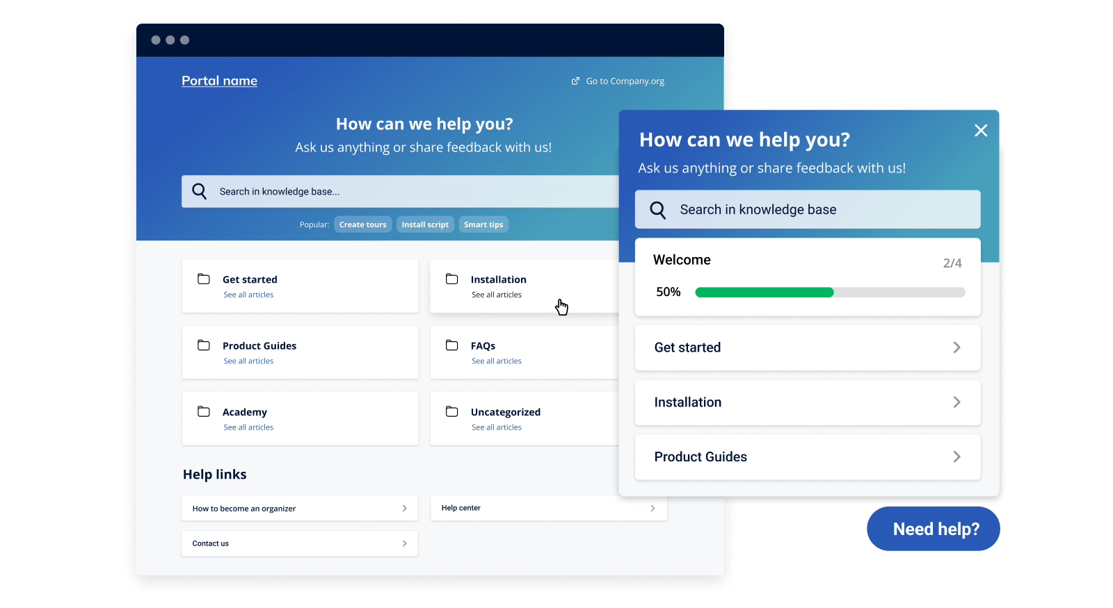 A well-structured knowledge base helps users self-solve, reducing support volume and empowering them with on-demand answers. It typically includes searchable help content, embedded how-tos, and context-aware suggestions (e.g., linking relevant articles from tips or tours).