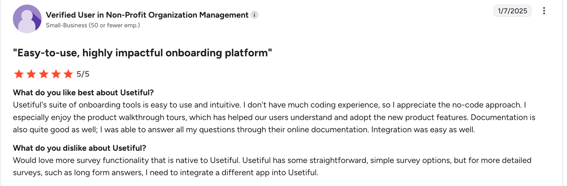 - Clear, focused feature set: Users like that Usetiful sticks to core onboarding features instead of trying to be an all-in-one platform with feature bloat.
