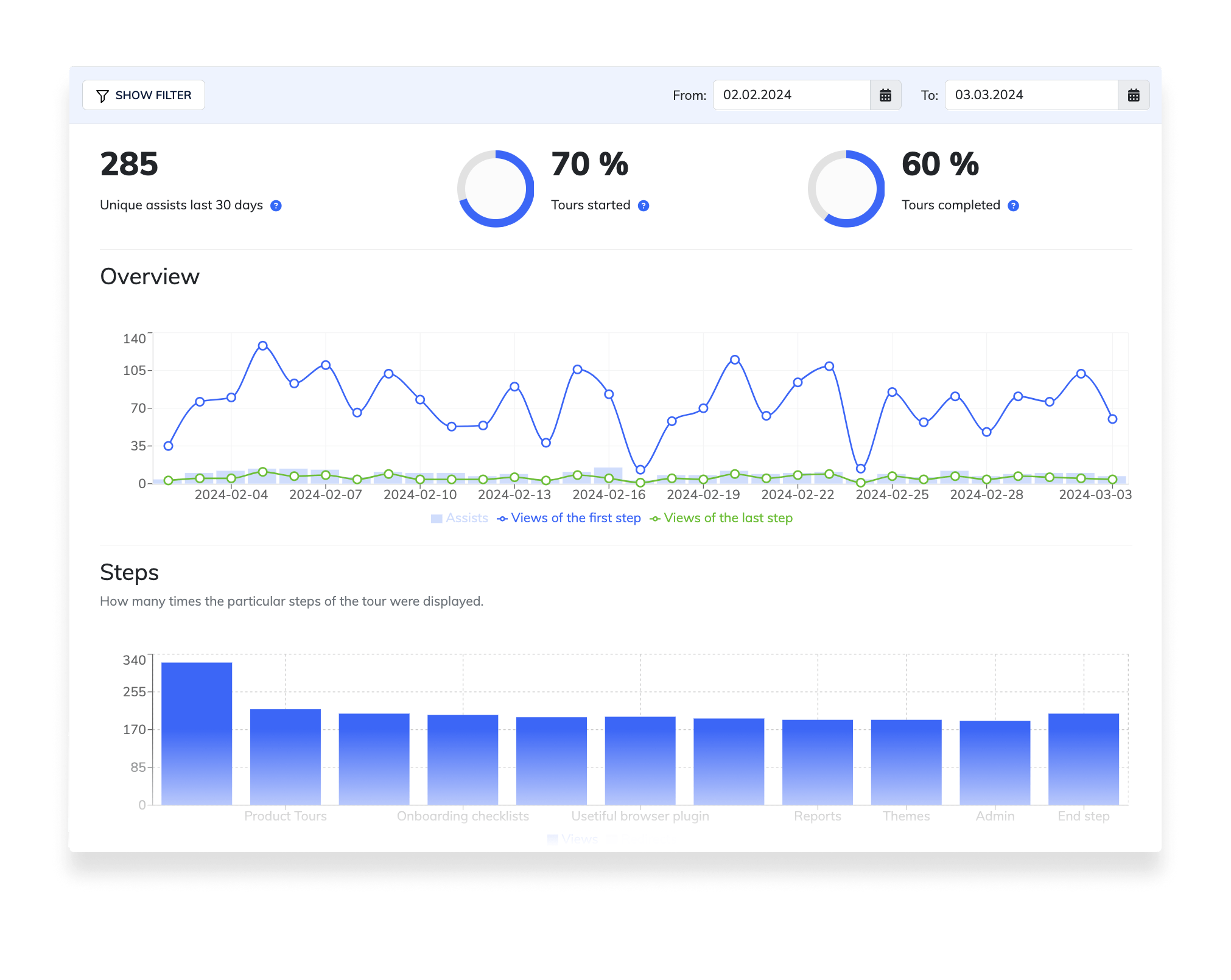Usage analytics show you how users interact with your content, giving you visibility into what works and what doesn’t. Usetiful tracks engagement with tours, demos, checklists, and tips, including starts, completions, and drop-off points.