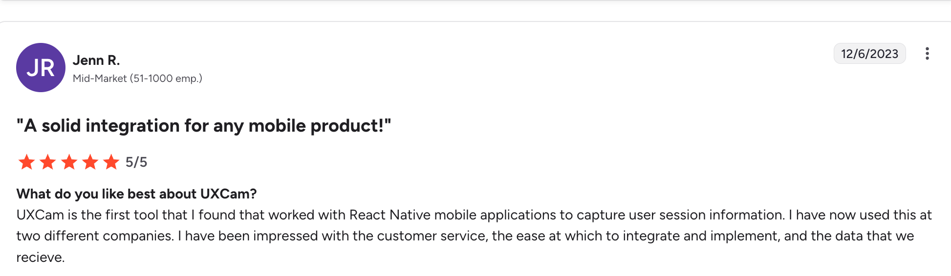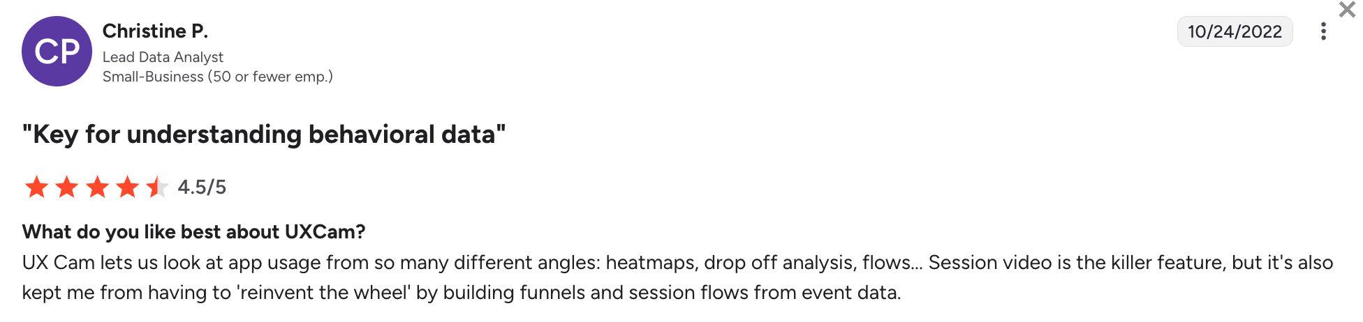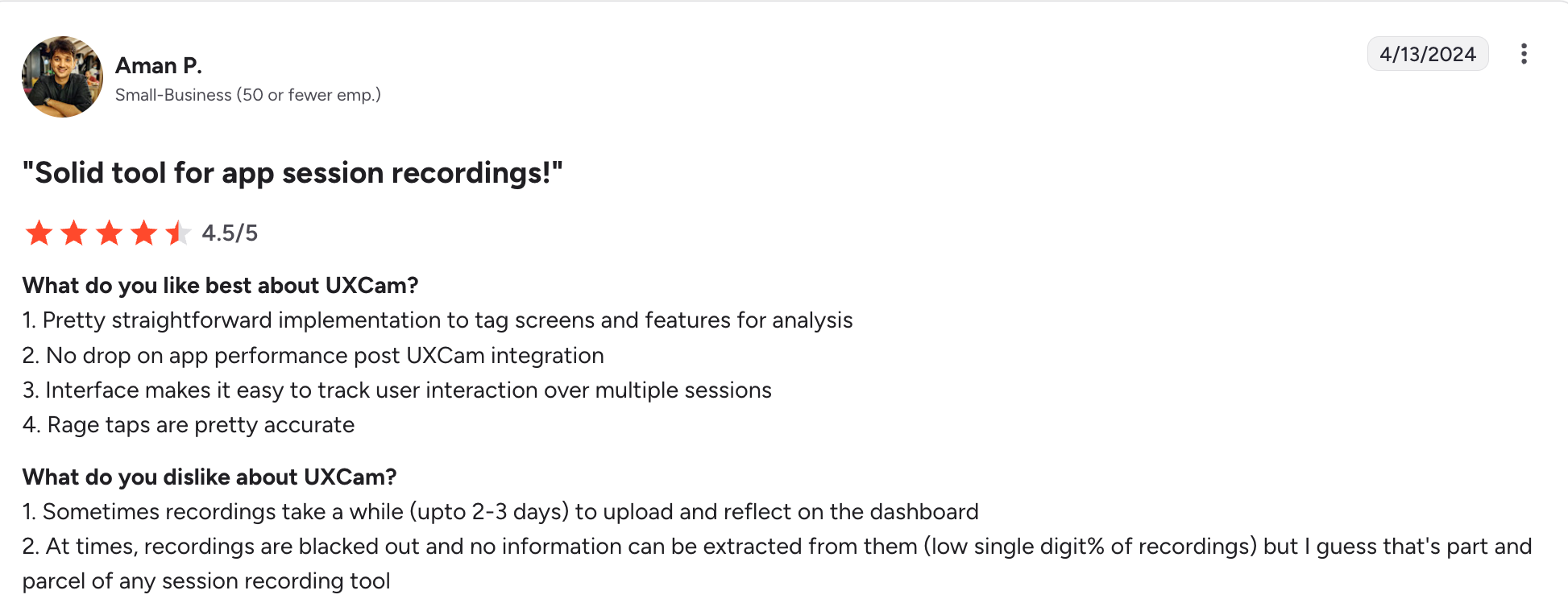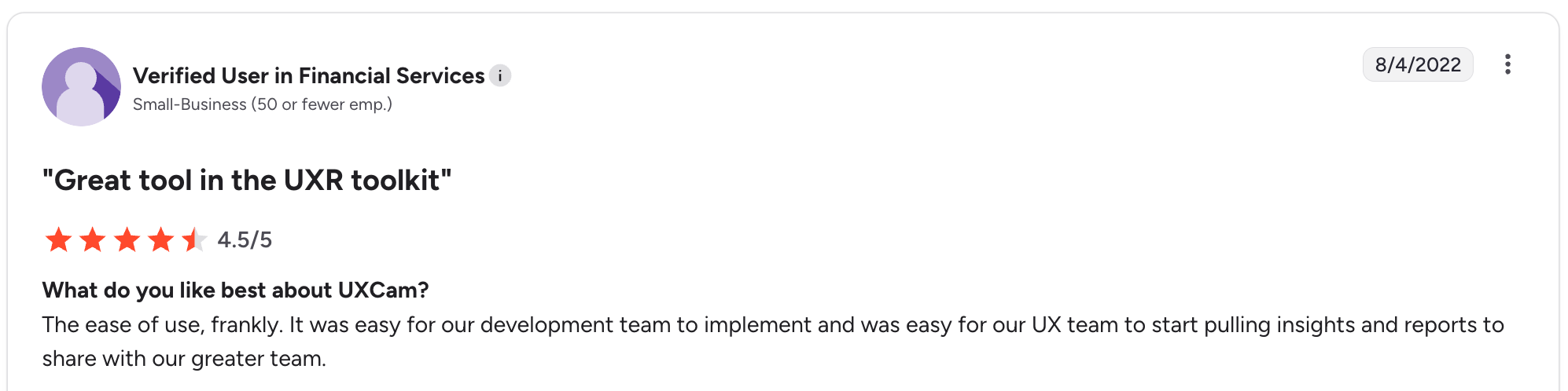 UXCam is also often praised for its good variety of features, different angles, and comprehensive insights it provides to cross-functional teams. Here’s what one user says in that regard: