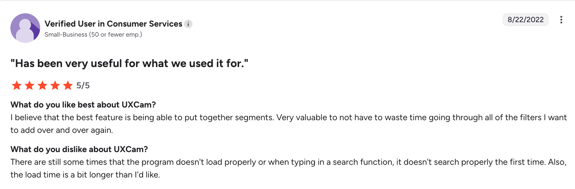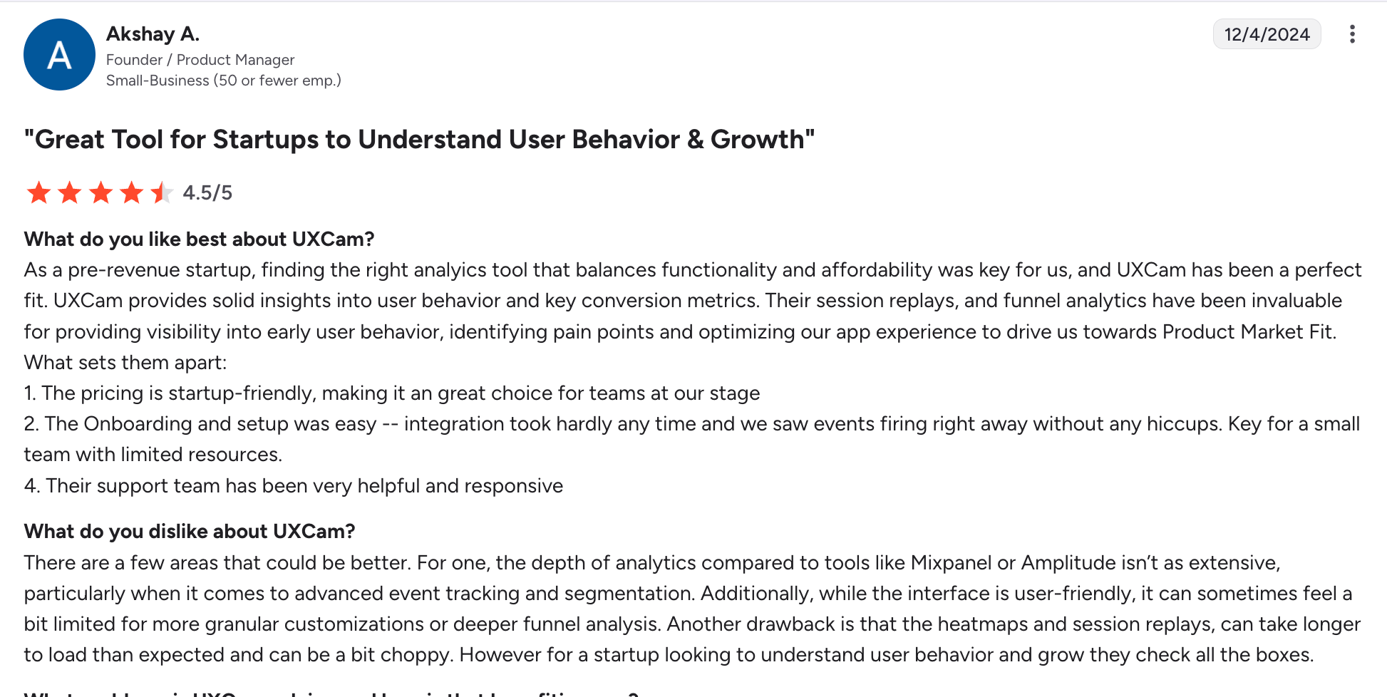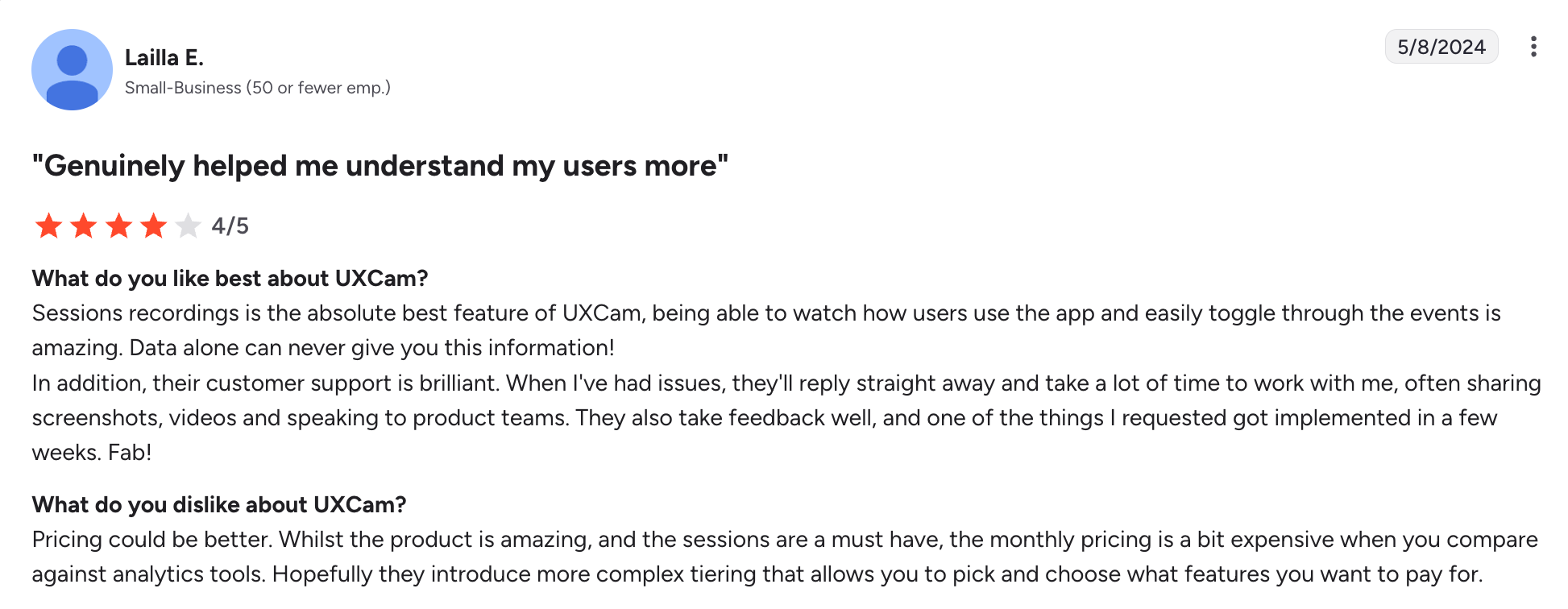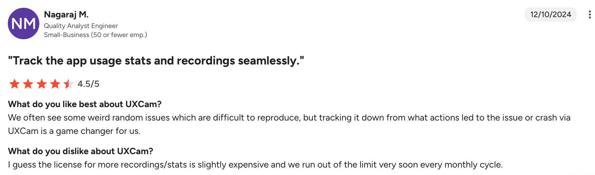 UXCam is also often praised for its good variety of features, different angles, and comprehensive insights it provides to cross-functional teams. Here’s what one user says in that regard: