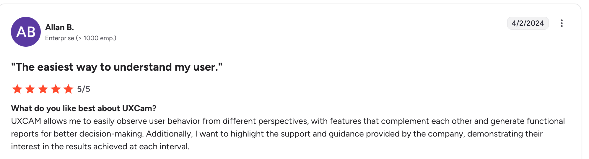 “UXCAM allows me to easily observe user behavior from different perspectives, with features that complement each other and generate functional reports for better decision-making. Additionally, I want to highlight the support and guidance provided by the company, demonstrating their interest in the results achieved at each interval.” – Allan B.