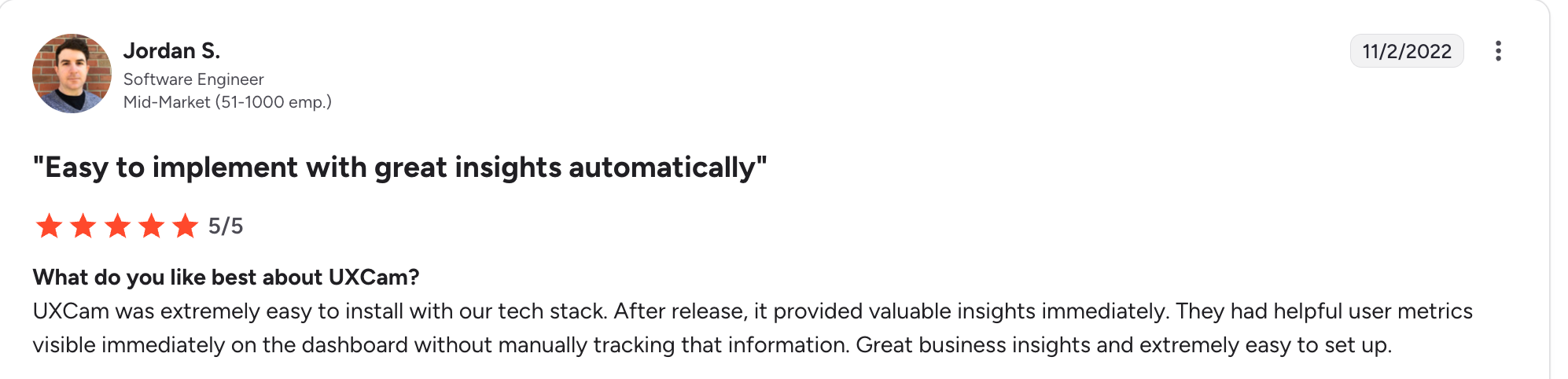 “UXCam was extremely easy to install with our tech stack. After release, it provided valuable insights immediately. They had helpful user metrics visible immediately on the dashboard without manually tracking that information. Great business insights and extremely easy to set up.” – Jordan S.