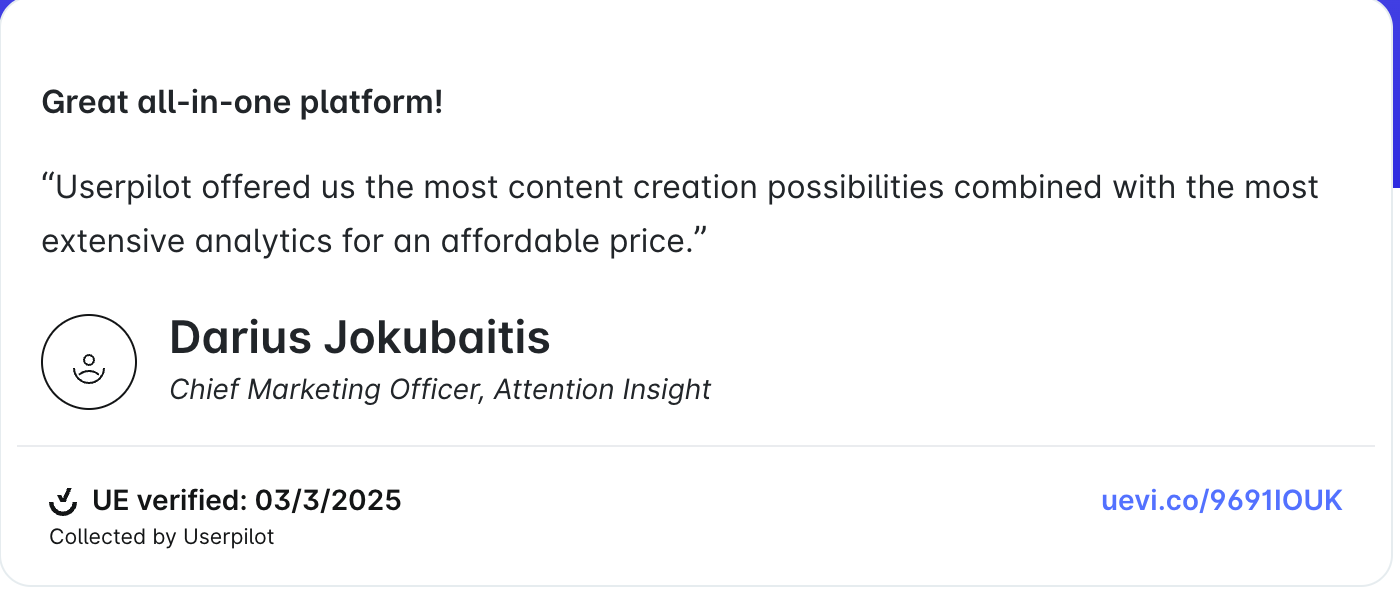 Userpilot strives to provide accurate information to help businesses determine the best solution for their particular needs. Due to the dynamic nature of the industry, the features offered by Userpilot and others often change over time. The statements made in this article are accurate to the best of Userpilot’s knowledge as of its publication/most recent update on December 27, 2025.