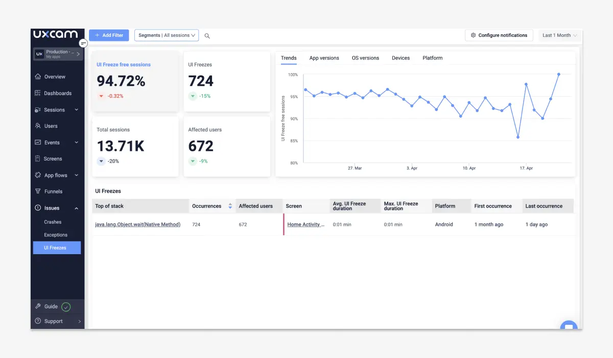 Issue analytics gives you real-time visibility into technical problems that impact the app experience, such as crashes and UI freezes. Rather than relying on siloed logs, UXCam ties these issues directly to session context so you see the root cause in action.