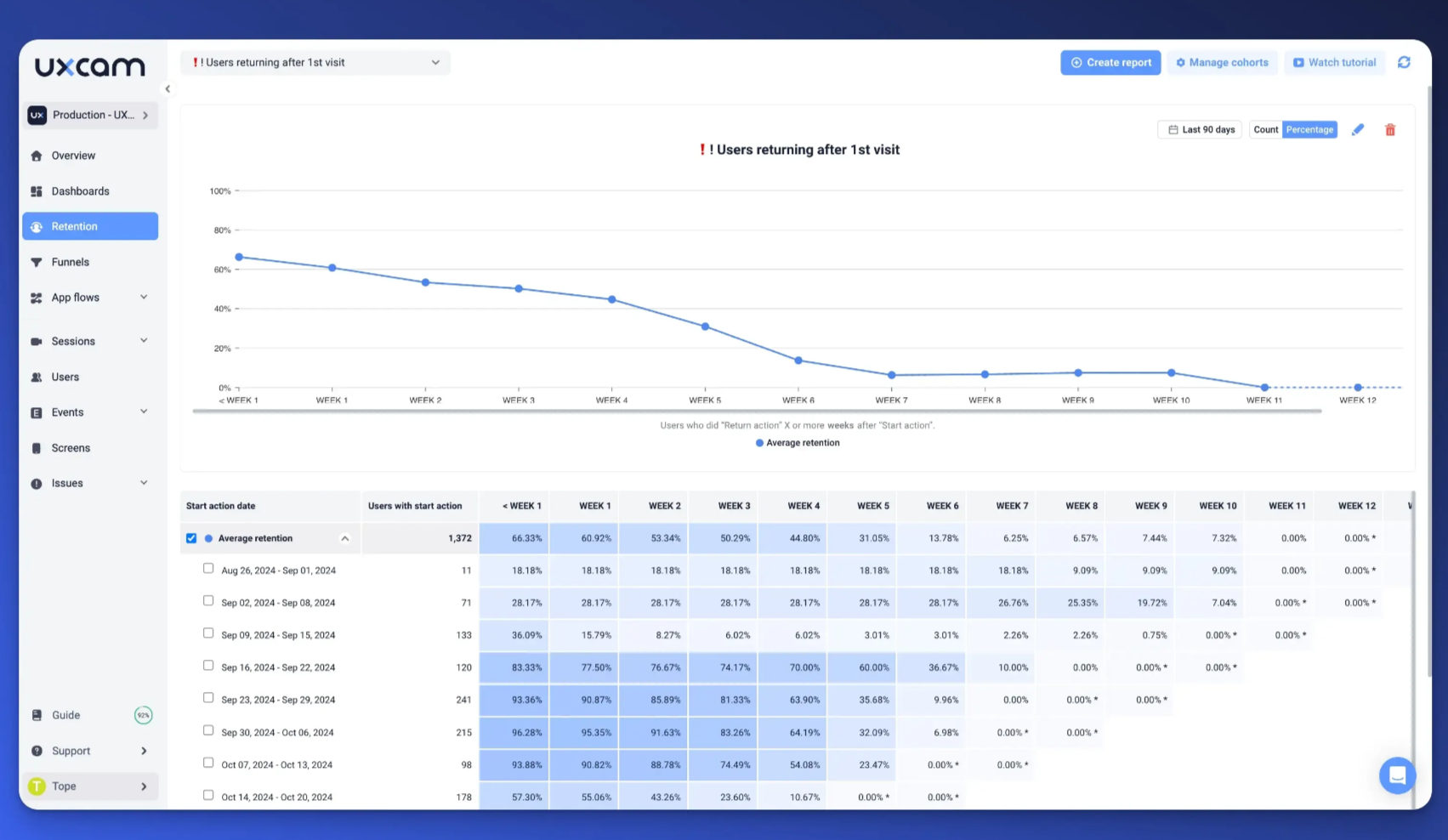 Retention tables and cohort analysis show you which behaviors drive loyalty. Rather than looking at isolated metrics, this feature groups users who started using your product during the same timeframe (a cohort) and tracks how many of them return or churn across subsequent days, weeks, or months.