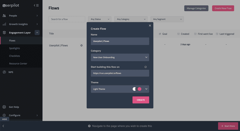 - Create a new flow and navigate the page where users signup, then add the link to build the onboarding flow on it.