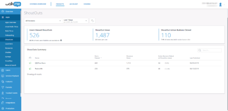 - Monitor the ShoutOut dashboard to track various metrics, such as how many times a ShoutOut was played or how often users clicked the CTA button. These insights can help you understand how users interact with different in-app messages. The analytics are fairly basic, though.