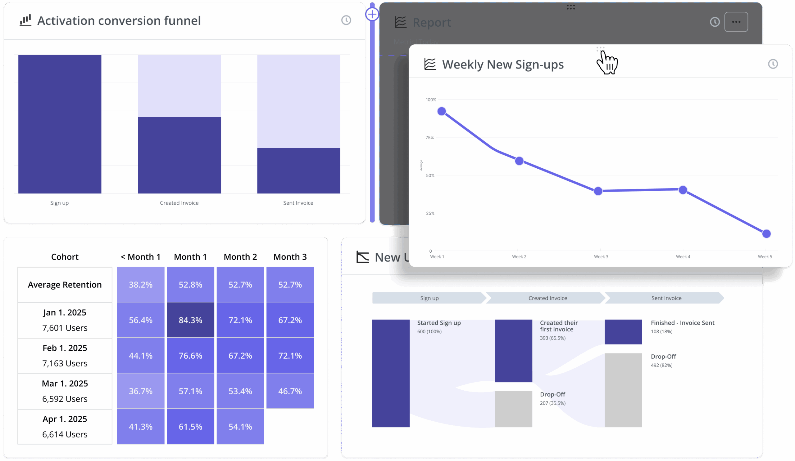 Use our pre-defined dashboards or build custom ones to track key metrics like product usage, activation, and feature adoption—all at a glance.